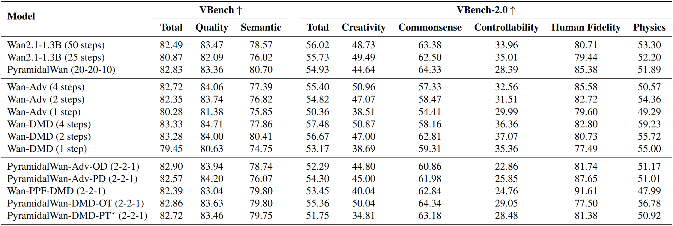 Overall, the highest quality is achieved by PyramidalWan-DMD-PT*, which we recommend as the final model recipe.