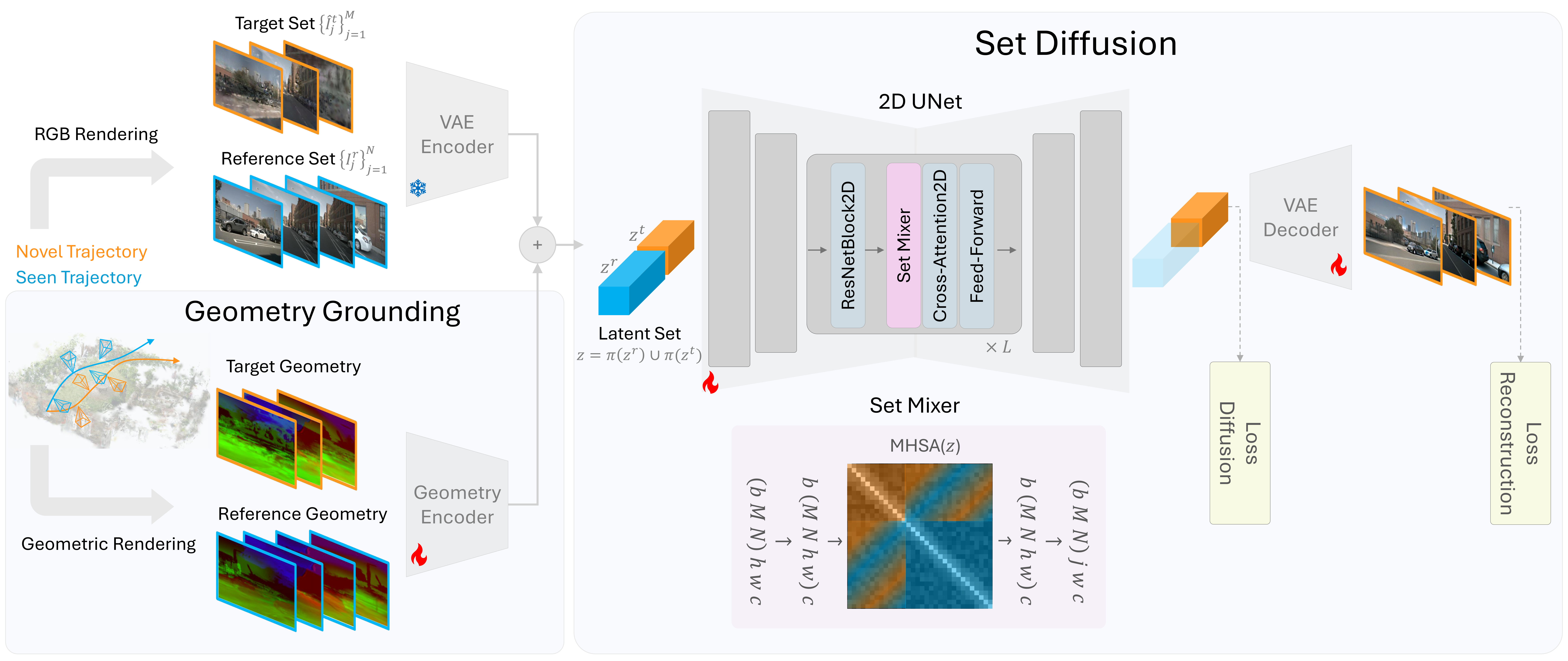 We present SetDiff, a geometry-grounded multi-view diffusion framework that enhances novel-view renderings produced by 3D Gaussian Splatting. Our method integrates explicit 3D priors, pixel-aligned coordinate maps and pose-aware Plücker ray embeddings, into a set-based diffusion model capable of jointly processing variable numbers of reference and target views. This formulation enables robust occlusion handling, reduces hallucinations under low-signal conditions, and improves photometric fidelity in visual content restoration. A unified set mixer performs global token-level attention across all input views, supporting scalable multi-camera enhancement while maintaining computational efficiency through latent-space supervision and selective decoding. Extensive experiments on EUVS, Para-Lane, nuScenes, and DL3DV demonstrate significant gains in perceptual fidelity, structural similarity, and robustness under severe extrapolation. SetDiff establishes a state-of-the-art diffusion-based solution for realistic and reliable novel-view synthesis in autonomous driving scenarios.