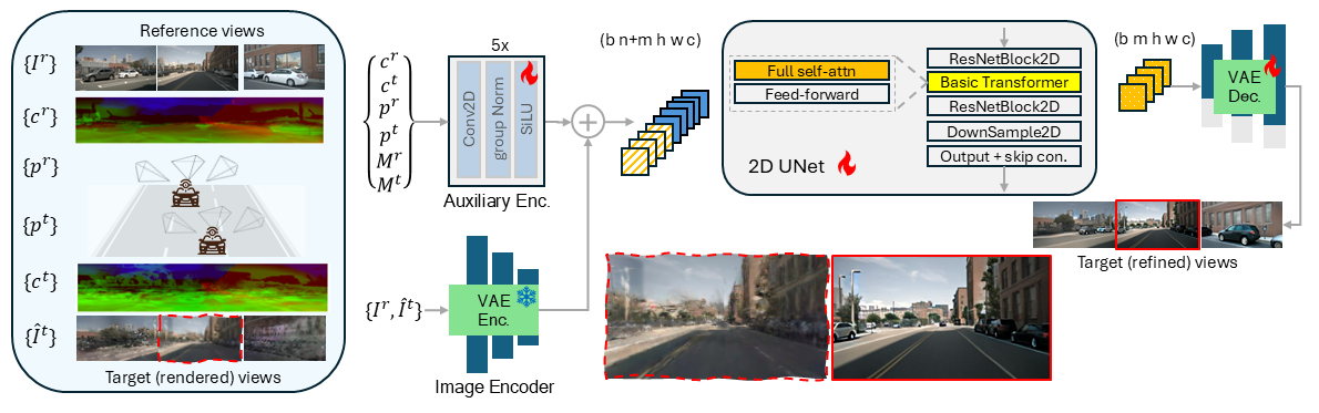 The backbone of ViewMorpher3D is a single-step image diffusion model (SD-Turbo), which enhances novel view images, rendered from 3D Gaussian Splatting (3DGS) representation. The diffusion process not only conditioned on low-quality rendered views but also the previously reference views, camera poses and 3D representation of 3DGS.